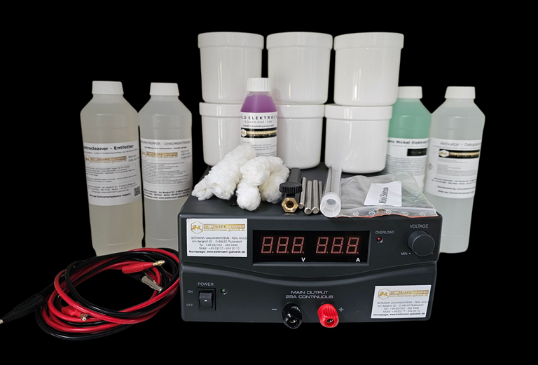 With this electroplating unit you can easily coat all metallic surfaces and objects made of e.g. tin, zinc, brass, copper, nickel, silver and stainless steel and chrome-plated surfaces or chrome-plated plastic (conductive layer) with all metals available on the market. e.g. real gold (999 fine gold) - rose gold, white gold, antique gold - silver - nickel - alkaline or acid copper - chrome - black chrome - rhodium - black rhodium - palladium - platinum - zinc, tin - bronze - in other words everything we have on stock according to our price list.
