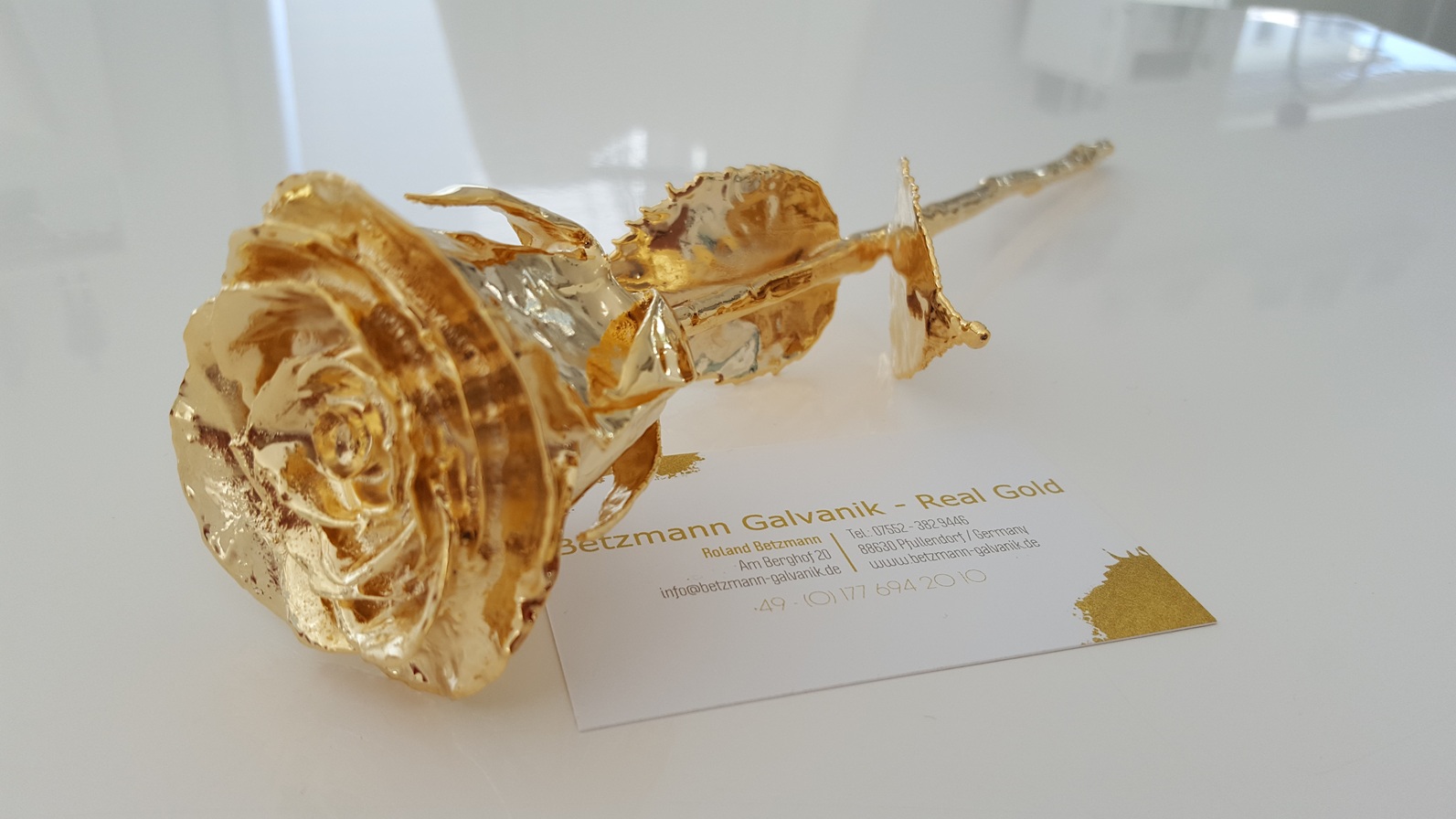 Die vergoldete Rose ist ca. 28 cm lang und die Blüte hat oben einen Durchmesser von ca. 6 cm